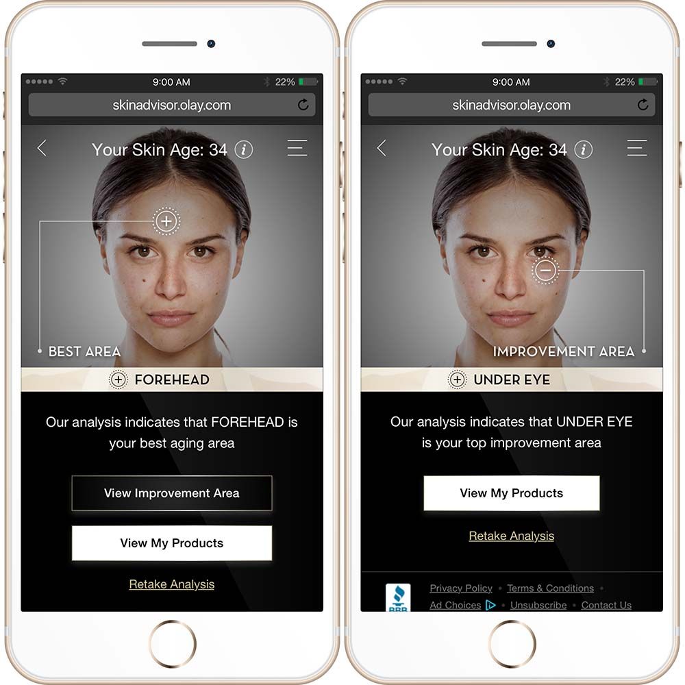 The tool stands on a database of tens of thousands of images of faces that Olay inputted into the system in order for the technology to understand what a woman’s face looks like at any age. Once your selfie is uploaded and your skin-care questions are answered, Skin Advisor hones in on five “key aging zones”: the forehead, cheek, chin, crow’s feet and under-eye, before determining your “best” and “improvement” areas (and just when you thought it couldn’t get any more honest, the tool also looks at images of women 10 years younger than your “skin age” to find out what’s holding you back from looking like that). Once everything is assessed, the last step is recommending the right Olay products that match both your skin type and concerns.