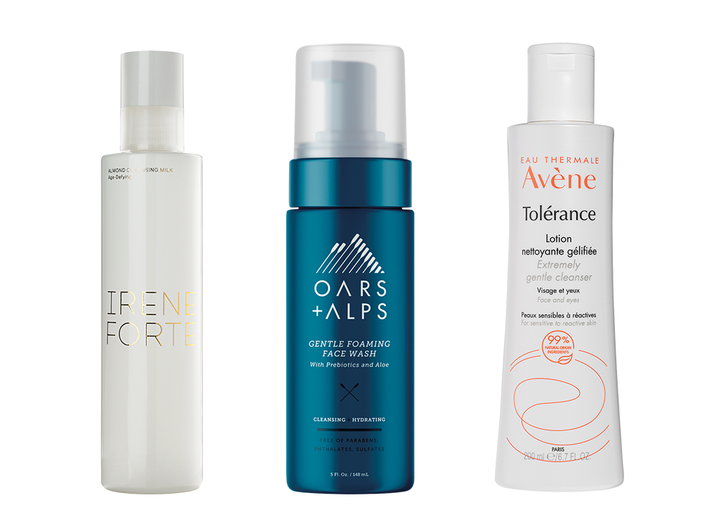 Left to right: Irene Forte Almond Cleansing Milk ($89), Oars + Alps Gentle Foaming Face Wash ($20), Avène Tolerance Extremely Gentle Cleanser ($24)
