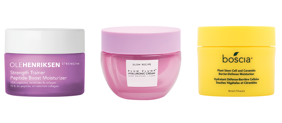 Left to right: OLEHENRIKSEN Strength Trainer Peptide Boost Moisturizer ($48), Glow Recipe Plum Plump Hyaluronic Cream ($39), Boscia Plant Stem Cell and Ceramide Barrier-Defense Moisturizer ($42)