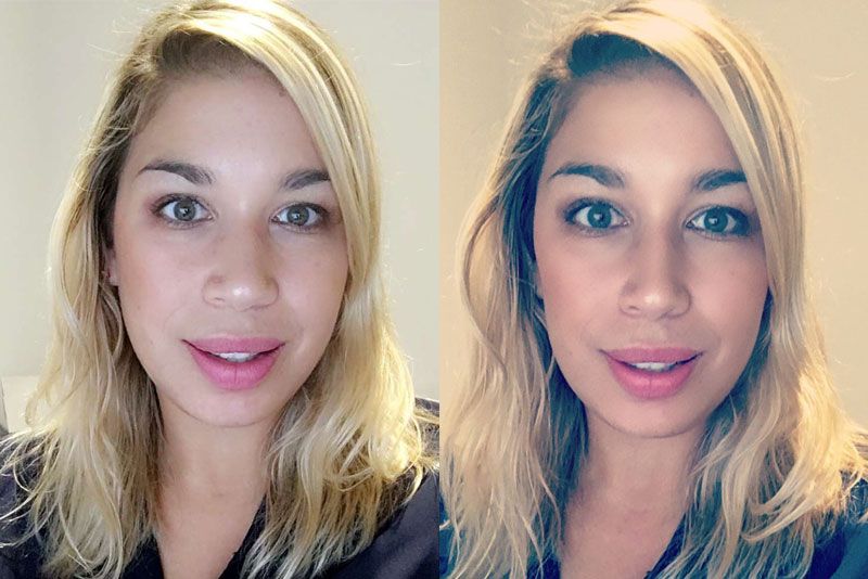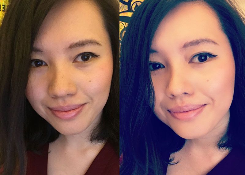 “I’ll be the first to admit that I love using this filter, especially when I have little to no makeup on—it makes you look awake and perfectly put together even when you’re the furthest thing from it. The big draw for me is the difference it makes on my skin. It hides any and all signs of discoloration, which is huge for me because melasma is a struggle. It also narrows my nose a tiny bit, which I don’t mind. But, the eyes—that’s where I draw the line. It makes me look like an anime character, and I really like my natural eyes. What?!”