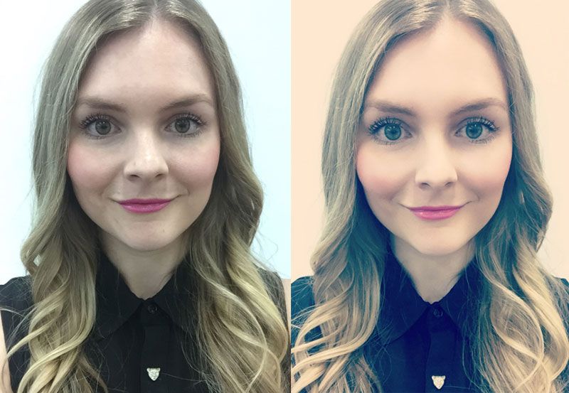 “While a clearer, smoother complexion is obvious, the filter also narrowed out my nose and made my brows appear fuller and darker. My eyes remained pretty much the same size, but the filter slimmed out my face and lips a notable amount, which made my eyes look larger than usual.”