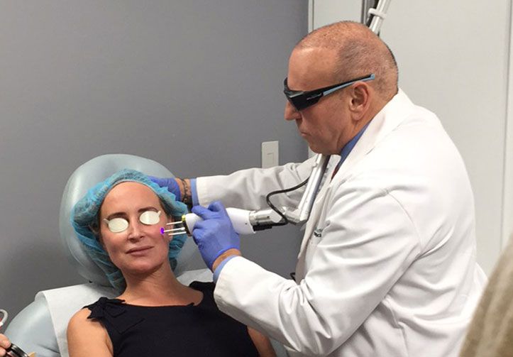 “It feels a little bit like static cling,” she explains. “Like tiny little zapping sensations. Annoying, but not painful like in the old days. The technology has come so far. For example, this machine is good for all skin colors, and it’s safe.” [Some lasers only work on lighter skin tones—if used on darker skin, they can potentially cause trauma to the skin and result in post-inflammatory hyperpigmentation.]