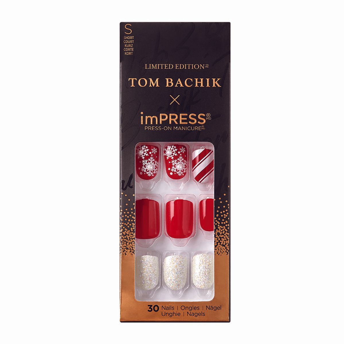 Tom: That’s the best thing about imPRESS is because one, they have what’s called a pure-fit technology. The material itself is super thin, so it’s actually more versatile, where the old-school press-on tips were set and they would only fit certain people. With the pure-fit, it actually flexes in and out, so if you have more of a curved nail or a flatter nail it works on multiple types. Plus, they have double-adhesive inside, that allows it to really bond and can last even up to four to five days. It’s literally a celeb-worthy manicure in minutes. You just press and go.