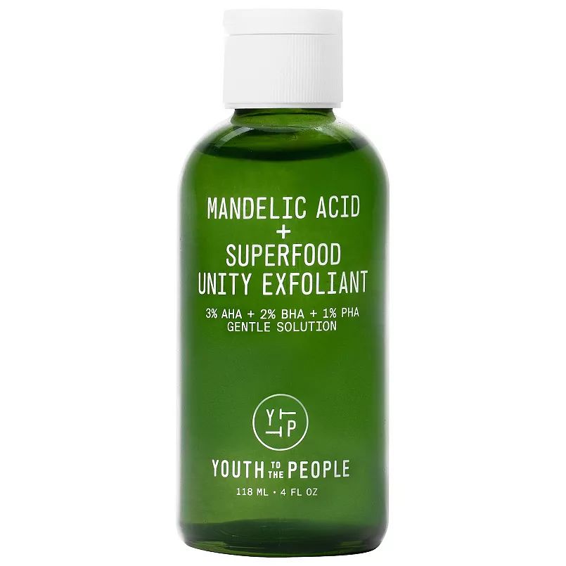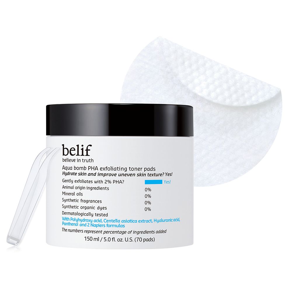Dermatologist recommended products: belif Aqua Bomb PHA Exfoliating Toner Pads ($24), Youth To The People Mandelic Acid + Superfood Unity Exfoliant ($42), MARA Plankton + PHA Flower Acid Algae Serum ($74)
