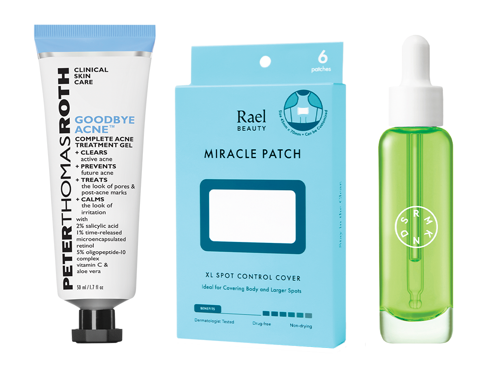 Pictured: Peter Thomas Roth Goodbye Acne Complete Acne Treatment Gel ($42), Rael Miracle Patch ($12) and Serumkind Muscat Clearing Drop ($45)