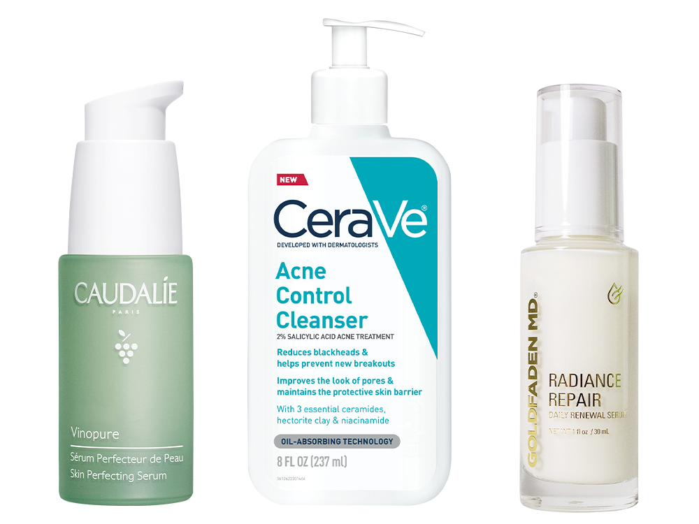 Pictured: Caudalie Vinopure Skin Perfecting Serum ($49) CeraVe Acne Control Cleanser ($14) and Goldfaden MD Radiance Repair daily Renewal Serum ($95)