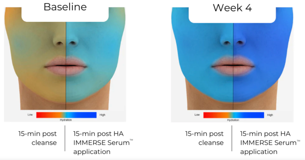 I first tried this serum last year during testing for our 2022 Beauty Awards, and like my fellow editors, fell in love fast. Ultimately it won the award for "Best Hyaluronic Acid Serum," for all of the above reasons why. Additionally, in clinical studies featuring hydration mapping (seen below), results proved both instant and long-term (at four weeks). I'm telling you, you can see and feel the difference in your skin.