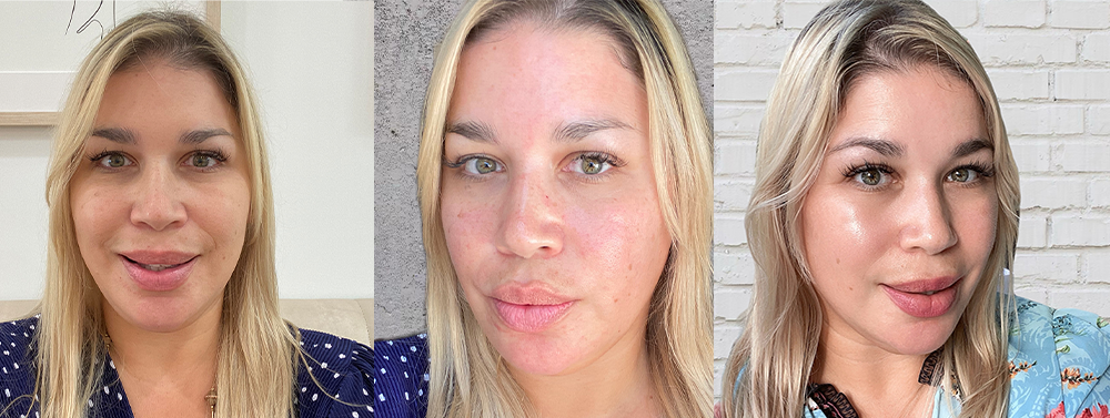 Features editor, Tatiana Bido, before, immediately after, and two weeks after her microneedling treatment with use of ALASTIN Skincare’s Regenerating Skin Nectar with TriHex Technology®.