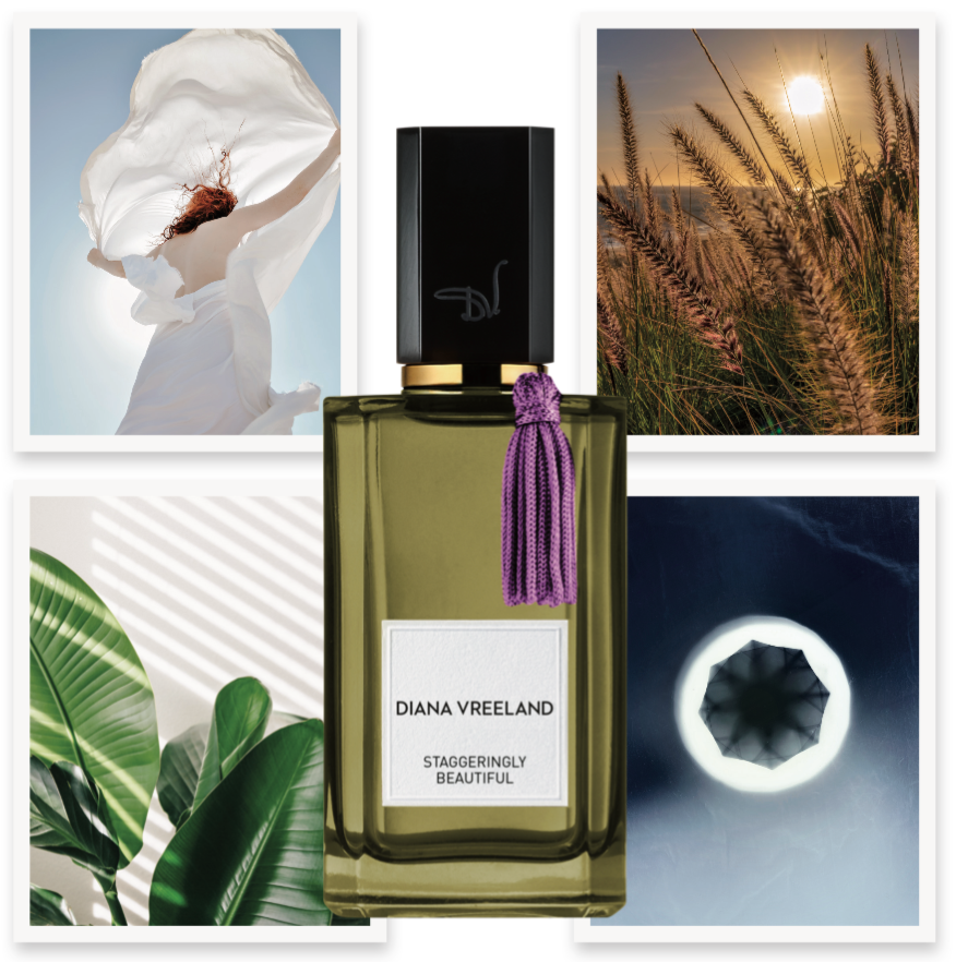 Perfumer Pascal Guarin’s sparkling fruity-floral pays homage to the late Diana Vreeland’s love of summers spent in the Mediterranean and the endless beauty inspiration she found there. Guarin’s nod to sweeping breezes and crystal-clear water is perfectly echoed in Spiegel’s (top right) shot of the coastline and “crisp air on the beach as the sun sets” and Grafkina’s (top left) photo of a woman twirling in the wind. Lemetti (bottom left) identified the fragrance’s green notes—fig leaf and daffodil—with her “strong feelings of green, grassy plants,” which, when married with zesty Sicilian bergamot, fruity fig and earthy Haitian vetiver, create an addictive cocktail Dobra (bottom right) called “dream-like,” as represented by her abstract shape in soothing shades of blue.