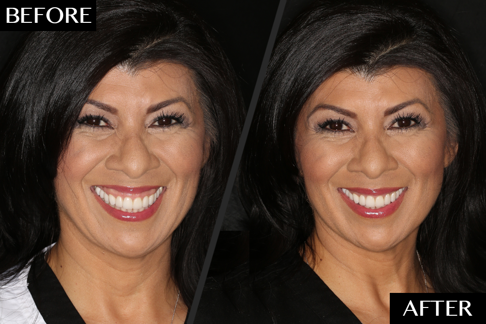 For the patient shown above, Beverly Hills, CA cosmetic dentist Laurence R. Rifkin, DDS says he used, “a combination of veneers and Botox Cosmetic injections right under the nose in the levator labii superioris muscles (the muscles that help us sneer) to deactivate the muscle group that elevates the lip excessively and show the gum tissue above the teeth themselves,” explains Dr. Rifkin. “As part of this treatment, I also have my patients perform smile exercises in front of a mirror for muscle strengthening to improve smile symmetry. Performing these exercises can also help increase the lip elevation on just one side of the smile if it is lower or weaker than the other side. Over time the effect is natural and the muscle is strengthened just like any other muscle that has been exercised.”