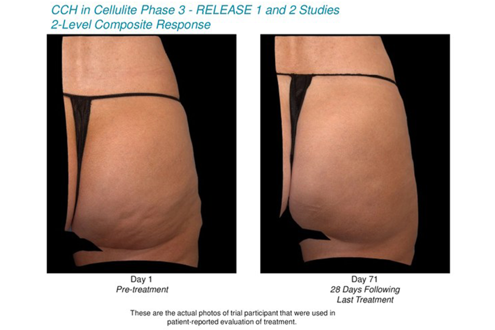 Findings concluded that subjects who received CCH had a statistically significant improvement in the researchers’ and patients’ assessments in the appearance of cellulite. In fact, 73.3 percent of subjects in RELEASE-1, and 67.8 percent of subjects in RELEASE-2 who received CCH reported “Improved,” “Very Improved” or “Very Much Improved” as assessed by the Subject- Global Aesthetic Improvement Scale in the appearance of their cellulite area in the buttock at Day 71 post-treatment, compared to only 43.2 percent and 24.1 percent of placebo subjects respectively.