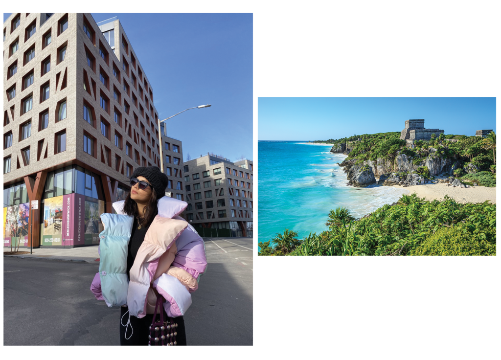 “I love winter and fall, because I love coats. My husband and I fight about it because it becomes a storage issue. I have a big rainbow puffer that is a piece I can’t ever part with,” except when she hits the beach. When she’s not making her annual trip to Tulum, Ramirez-Fulton gleans “all kinds of inspiration” from @somewhereiwouldliketolive on Instagram.