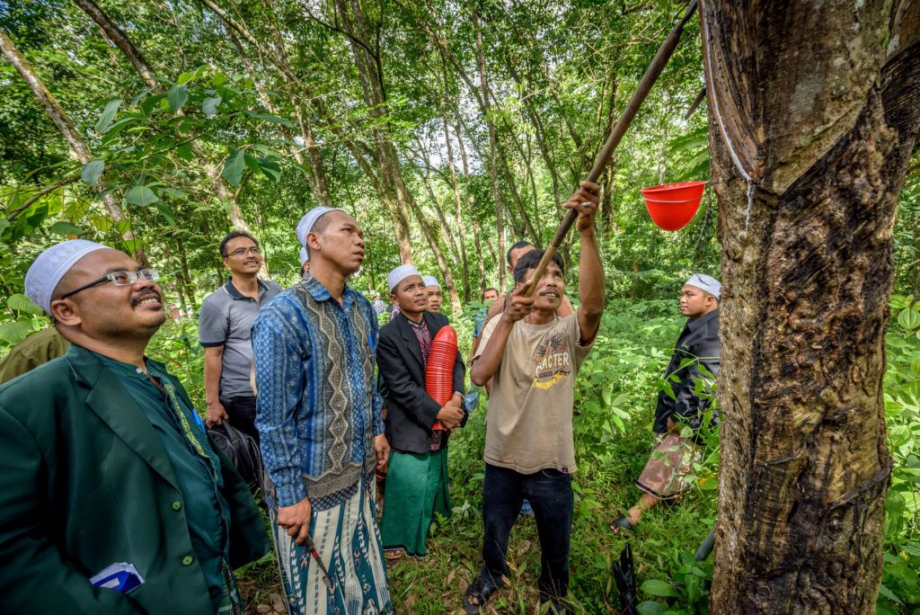 Teachers at an Islamic boarding school (pesantren) in Madailing Natal, North Sumatra, learn a new rubbber tapping technique from SLP staff. The teachers are also rubber farmers.