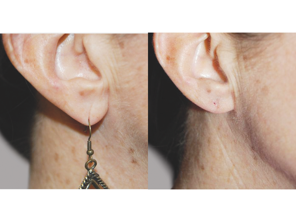 Dr. Pollack performed an in-office earlobe repair on this 50-year-old patient in order to decrease sagging caused by heavy earrings and restore the ear's youthful appearance.