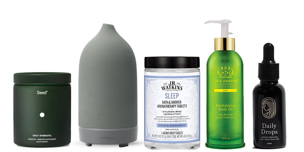 "I try my best to drink 120 ounces of water a day to boost my energy levels—Khloé's water-bottle trick seriously works—and it's done wonders for my mood. I take Seed's Daily Synbiotic ($50 monthly) to keep my gut in check and Athletic Greens is a life-saver when I need to sneak more greens into my diet. While I prep for bed, I keep a Vitruvi Stone Diffuser ($119) on my nightstand, usually with The Well's Relax Essential Oil Blend ($48) going. I wish I was a bath person, but I can't bring myself to become a fan. Instead, I drop a J.R. Watkins Sleep Bath & Shower Aromatherapy Tablet ($15 for six) into a steamy shower and let it work its relaxing magic. Once I'm out, I apply Tata Harper's Revitalizing Body Oil ($120)—its scent instantly calms me—and before climbing into bed, I reach for Equilibria Daily Drops to help keep my mind quiet throughout the night."