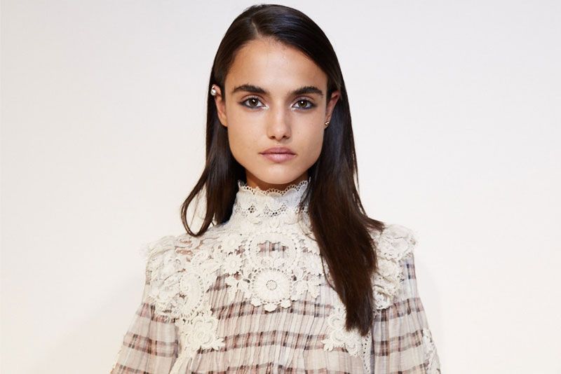 “The beauty look at the Zimmerman show was modern and feminine and I love the contrast on the eye by using dark shadow on the lower lash line and metallic shadow on the inner corners. Plus, that strong brow paired with a muted lip. Ooh la la. Makeup artist Jodie Boland for Maybelline New York wanted the look to be very natural, with little to no makeup, giving the models just a bit of an edge by playing with gray shades along the lash line, specifically Maybelline New York Color Tattoo Concentrated Crayon in Charcoal Chrome.”