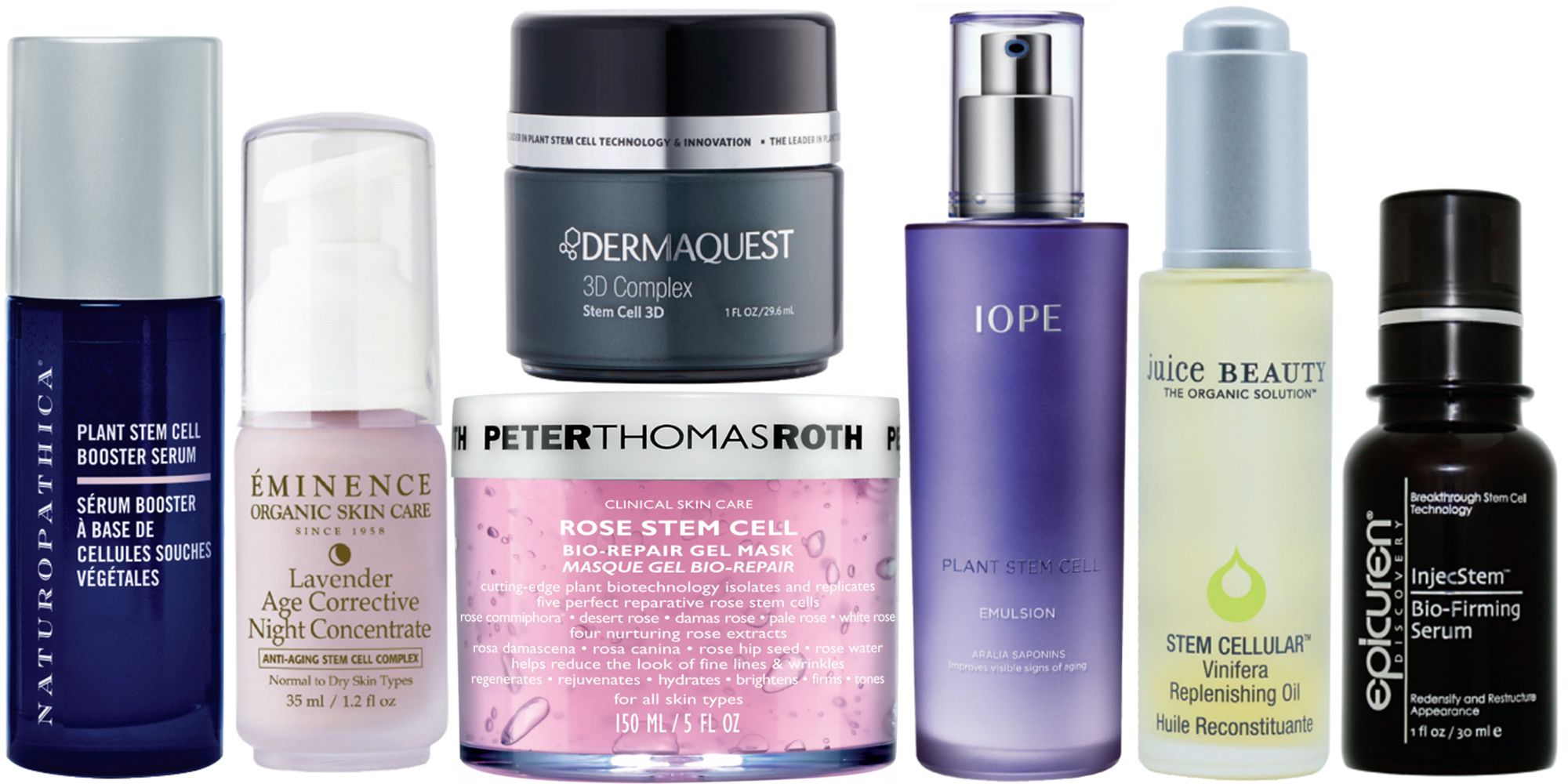 IOPE Plant Stem Cell Emulsion ($40), Juice Beauty Stem Cellular Vinifera Replenishing Oil ($72) and Epicuren Discovery InjecStem BioFirming Serum ($220).