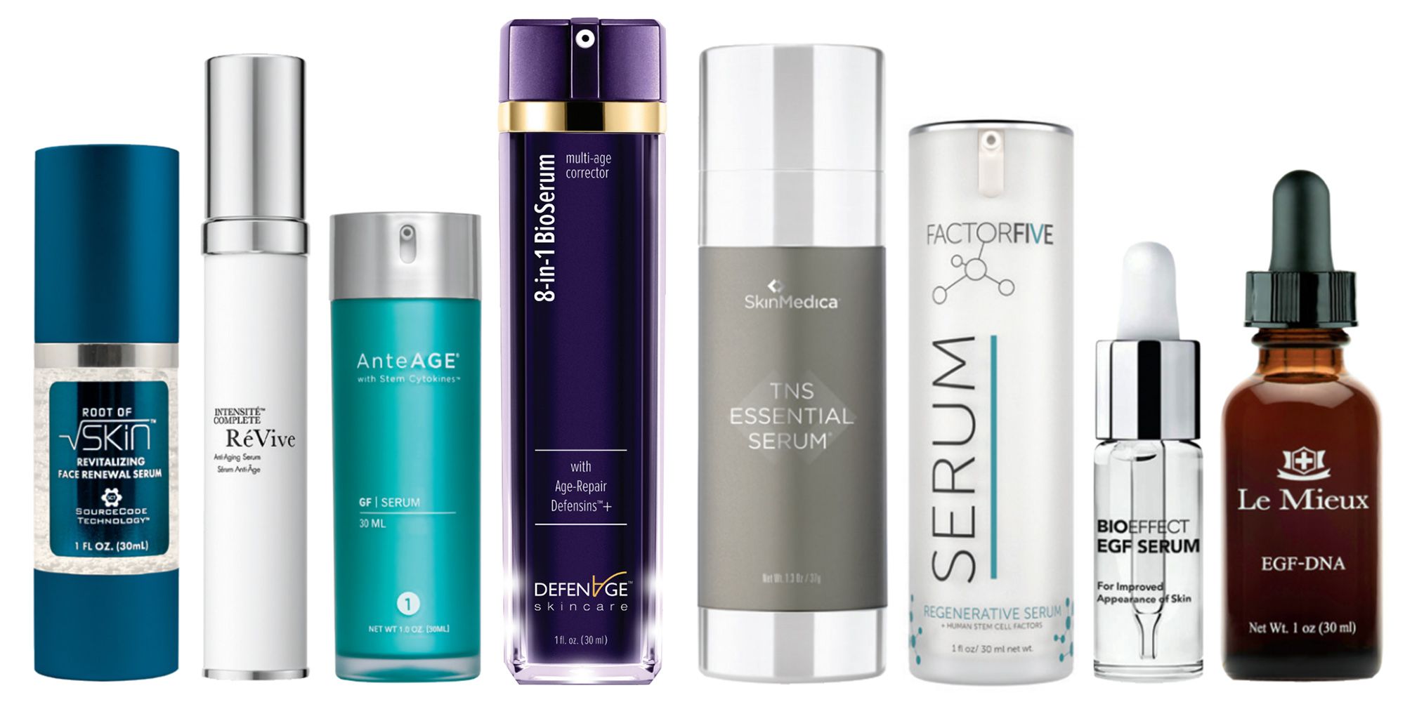 Growth factor serums to try: Root of Skin Revitalizing Face Renewal Serum ($78), RéVive Intensité Complete Anti-Aging Serum ($485), AnteAGE Serum ($150), DefenAge 8-in-1 BioSerum ($220), SkinMedica TNS Essential Serum ($281), FactorFive Regenerative Serum ($199), BioEffect EGF Serum ($160), and Le Mieux EGF-DNA Serum ($110).