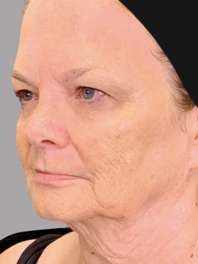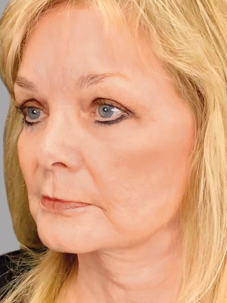 Dr. Hartman treated this business owner in her 70s for "aging face concerns." She had a living-fat transfer to the face along with a facelift, browlift, eyelid rejuvenation procedures, and resurfacing lasers. Her case was done comfortably awake with a tumescent lidocaine/prilocaine solution and ProNox laughing gas (no general anesthesia). She was back to work in 6-7 days.