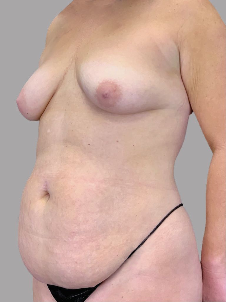 To address the concerns of this young mom in her mid-30's regarding her lower abdomen fullness and deflated breasts, Dr. Hartman performed a living-fat transfer breast re-volumization using the BeautiFill laser and a subsequent tummy tuck—all done comfortably awake using tumescent lidocaine/prilocaine anesthesia and ProNox (laughing gas). She was back to her routine in 4 days. She is shown here 10 days after her procedure.