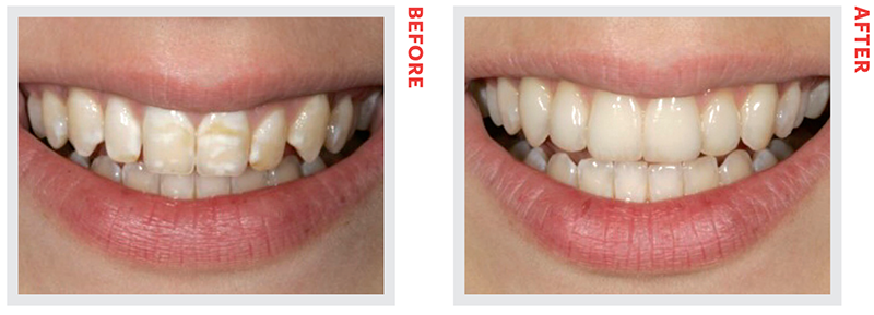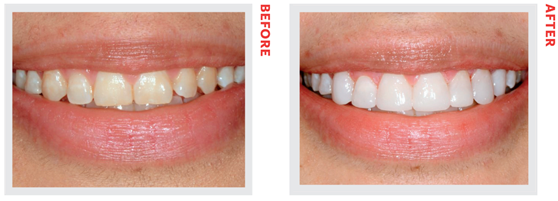 This relatively quick and easy in-office procedure can instantly brighten your smile in less than an hour. More powerful than at-home whitening products, laser-based whitening uses light to speed up the bleaching process. First, superficial stains that can be buffed away are removed from teeth before the bleach is applied and activated with a light or laser. Unlike whitening strips, in-office treatments give a more uniform color to the teeth because the solution penetrates the entire tooth. At-home maintenance with custom, molded trays is an important element that extends the treatment from the office to the home. The results can last from a few months to a few years depending on how often touch-ups are done at home. Average Treatment Cost $350–$1,000 per treatment*