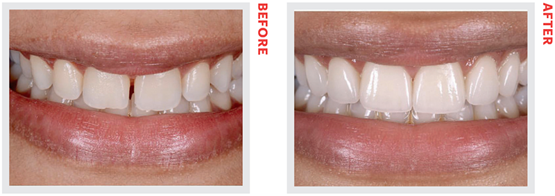 To conceal minor smile imperfections—spacing, chips and dark stains—tooth bonding is performed by sculpting tooth-colored resin over the nooks and crannies of the teeth to give the appearance of a straighter, more balanced smile. A conditioning solution is first applied over the surface of the enamel, roughening the outermost layer of teeth to ensure a stronger bond. Afterward, layers of the material are sculpted over the teeth as needed, and then set in place with a special light that hardens the plastic within seconds. The edges of the teeth may also be lengthened to correct a short smile or build out the back teeth to hold out the cheekbones, which creates the appearance of more chiseled bone structure. Average Treatment Cost $350–$2,500 per tooth*