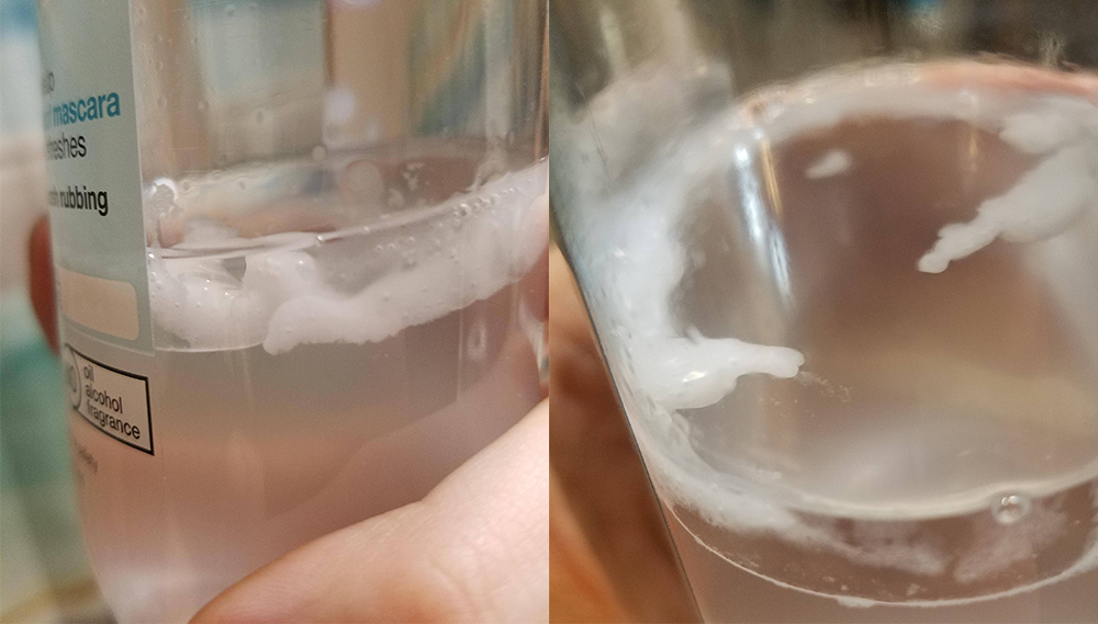 In a viral Reddit thread, Skinnyjunk writes: “I noticed something [weird] started growing in my third bottle (which I got from Ulta), and it kept getting bigger and bigger. For a while I didn’t realize that’s what was setting my skin on fire and breaking me out in tiny little red and white bumps all over my cheeks in localized clusters, giving me random red patches, and making everything I put on my skin sting like hell. I would compare it to what a damaged moisture barrier is like. When your skin flips out at anything you put on it and everything hurts. It even hurt from gentle touch. I saw some weird floating white flakes in it occasionally, but they would disappear and the liquid would look normal. It was a little cloudy, but I didn’t notice that that was out of the ordinary and thought maybe it just hadn’t settled all the way. Well the flakes kept getting bigger until they became big white globs that would move between the two layers. And one day I saw them and that was when I finally decided that I was completely done with that bottle. Something wasn’t right.”