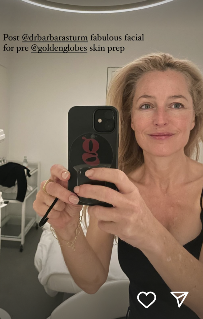 While the magic of top-tier makeup artists is often credited for the luminous looks on award show nights, Anderson decided to let her followers in on her pre-red carpet ritual. Just three hours before her dazzling debut, she took to Instagram, sharing a makeup-free selfie and revealing, "Post @drbarbarasturm fabulous facial for pre @goldenglobes skin prep."