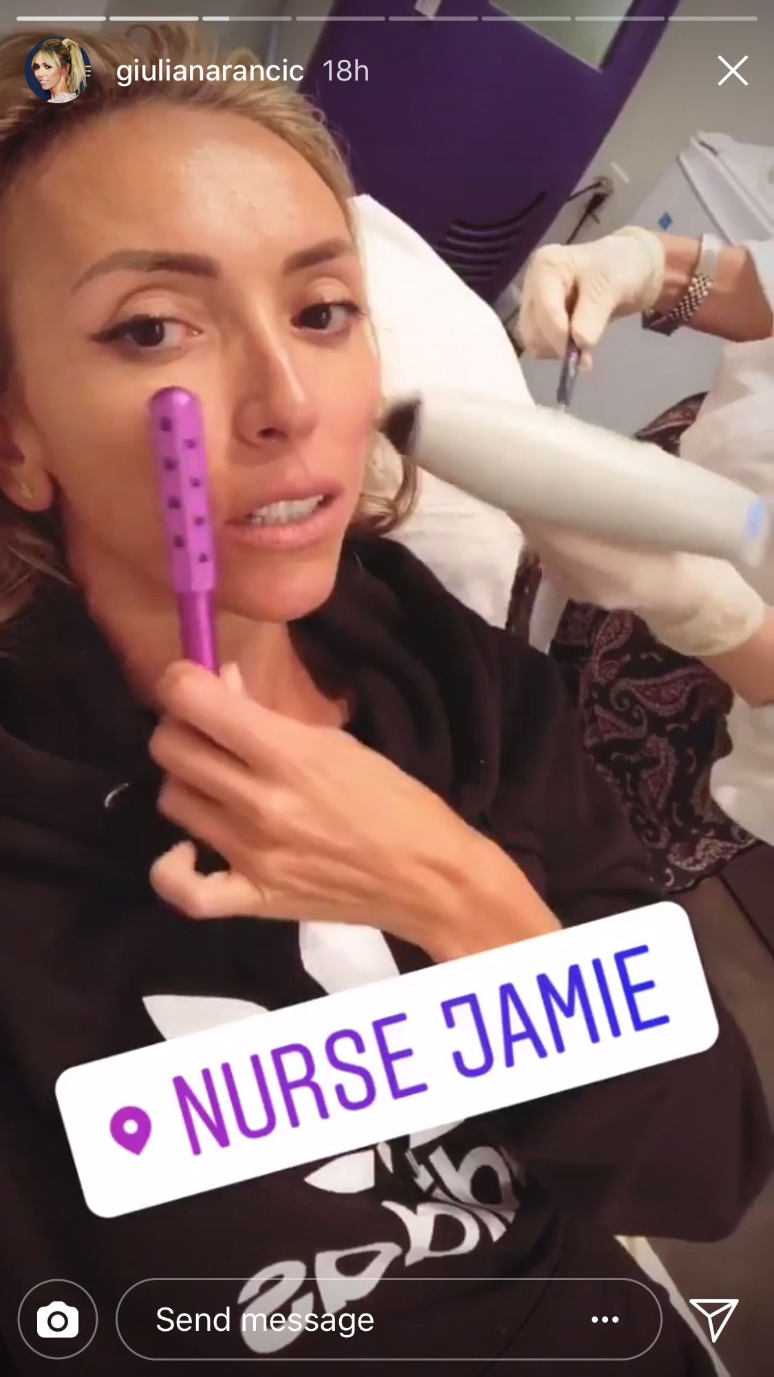 The awards circuit regular popped by Nurse Jamie’s spa, where she always goes before hitting the red carpet, for the “Code Purple” facial. In addition to receiving the professional procedure—radio-frequency skin-tightening paired with the UpLift facial roller—Giuliana also left with a ton of new Nurse Jamie goodies, saying “All done. I love my skin right now!”