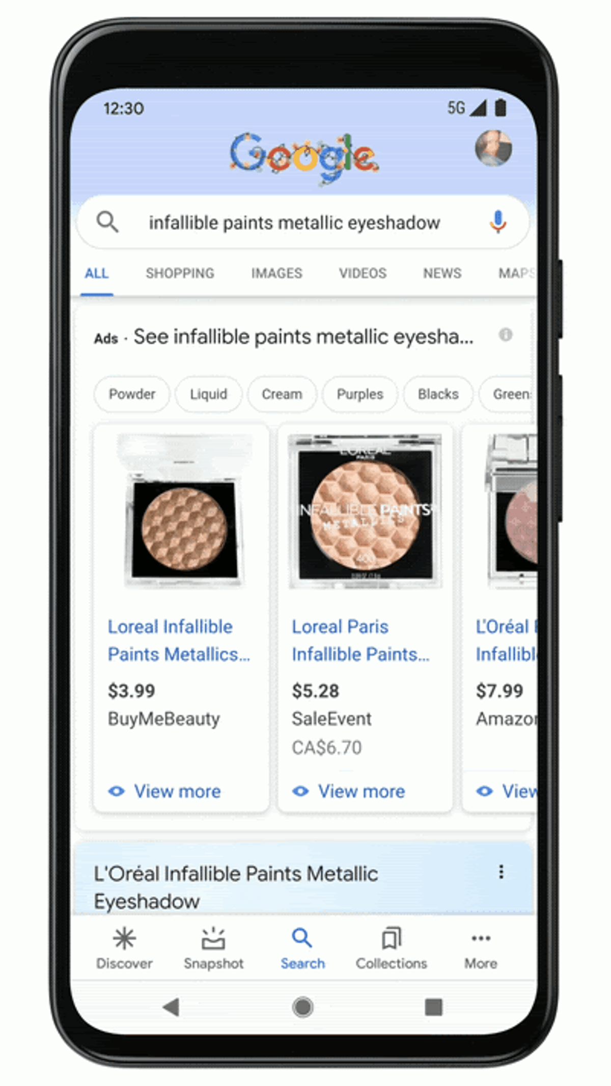 To use the feature, simply search for an applicable eyeshadow or lipstick—cult-favorite brands including L’Oreal, MAC Cosmetics, Black Opal and Charlotte Tilbury are currently included in the lineup—and browse. You can also virtually try on these products straight from the Google app.