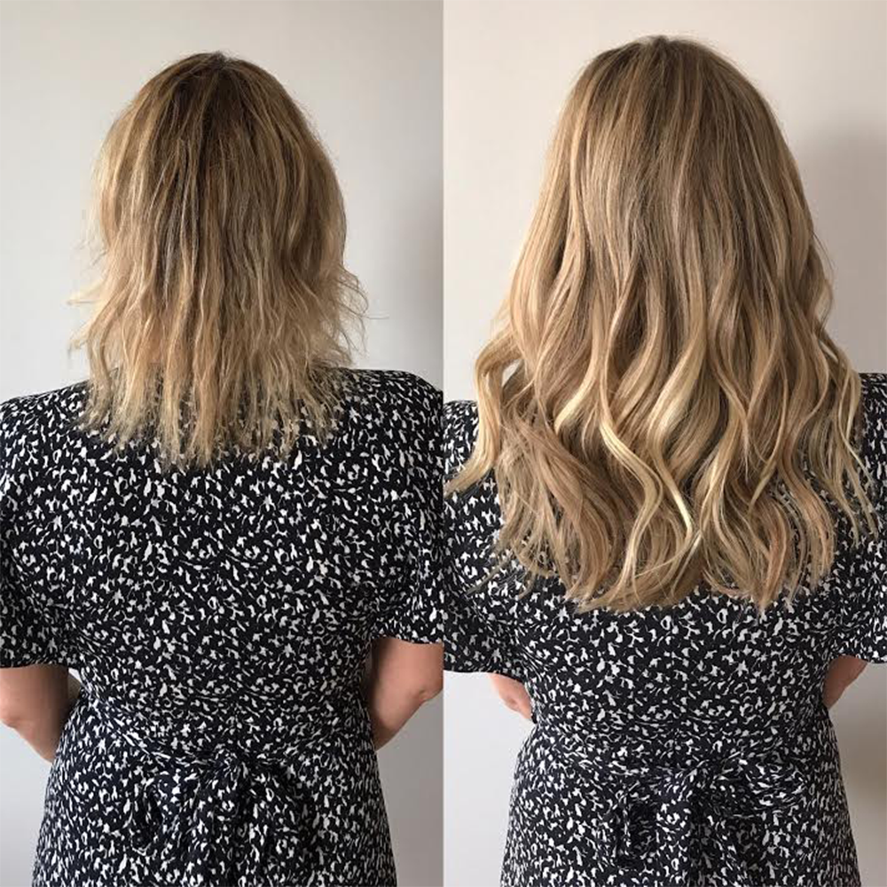 Celebrity hairstylist Clayton Hawkins used The Hair Shop keratin bond extensions to thicken and lengthen this client’s thinning hair.