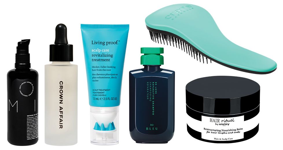 Reverie Milk Nourishing Treatment ($42); Crown Affair The Oil ($40); Living Proof Revitalizing Scalp Treatment ($32); R+Co BLEU De Luxe Reparative Shampoo ($59); Crave Naturals Detangling Brush ($12); Hair Rituel by Sisley Restructuring Balm ($120)