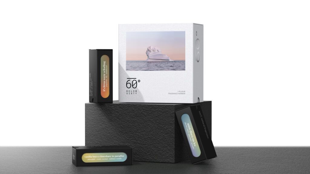 Below 60º features a flagship plug-in product line with three natural scents: Mint Disco on Ice, If Citrus Were a Feeling, and Vanilla Buys a Timeshare in Paradise. The line also includes a subscription option for $29.97 which includes a Free Plug-in Fragrance Diffuser and three fragrance refills, adding up to a 3-month supply of fragrance.