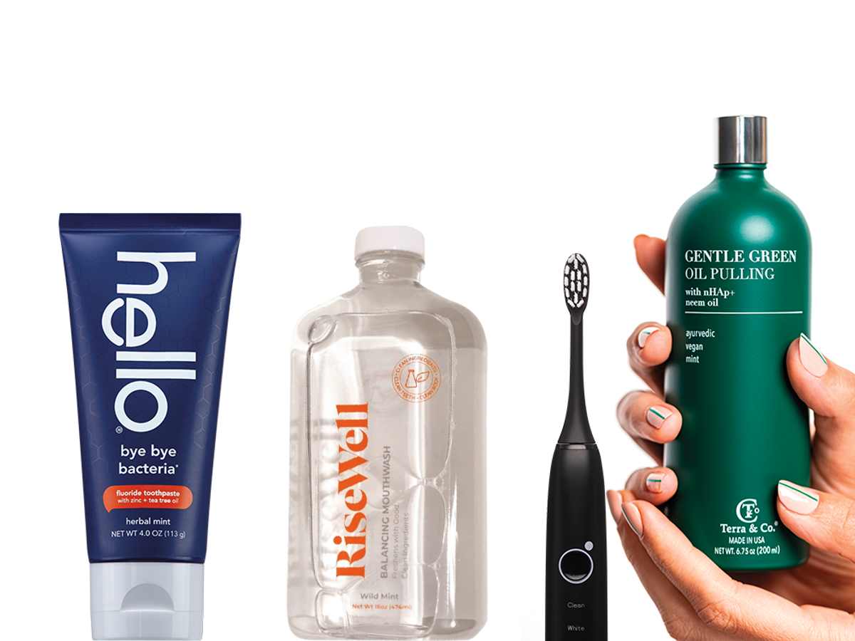 HELLO ByeBye Bacteria Fluoride Toothpaste ($6), Risewell Balancing Mouthwash ($18), MOON The Electric Toothbrush ($50), Terra & Co Gentle Green Oil Pulling ($40)
