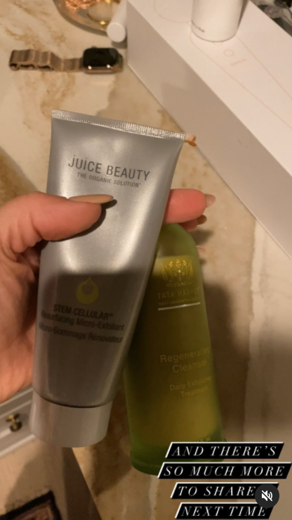 Next, she shows Juice Beauty Stem Cellular Resurfacing Micro-Exfoliant ($56)—a physical and chemical exfoliator designed to slough off dead, dull skin cells—and the safe-for-daily-use Tata Harper Regenerating Cleanser ($84) some love, pinning the duo as "two exfoliators I love."