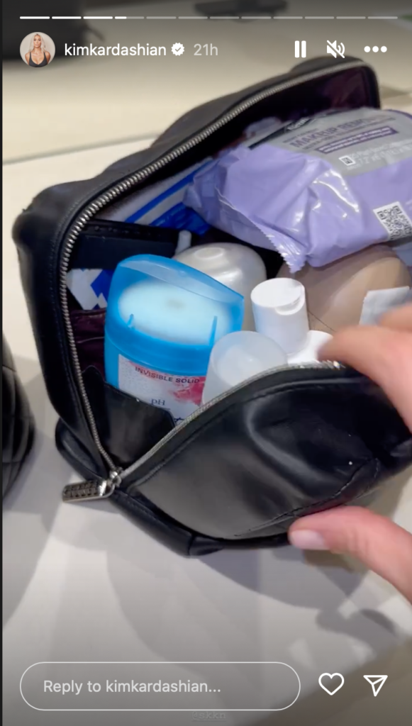 Last night, Kardashian posted an IG story showing off her brand’s latest product drop: a sleek, spacious makeup bag. In proving how much this new bag can fit, the star showed her current, cluttered makeup bag which she says she literally carries “a whole pharmacy” in, during which two classic, budget-friendly products can be seen: Secret’s Solid Antiperspirant and Deodorant in Powder Fresh ($7) and Neutrogena’s Night Calming Wipes ($8).