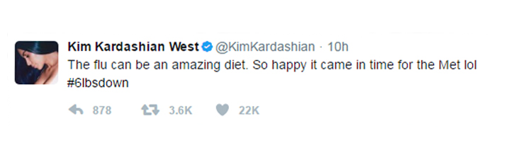 While plenty of her followers sounded off with responses like: “Kim Kardashian called influenza a diet,” and “Girl I love you and all but what,” Kardashian West has been open about her weight-loss tactics, especially post-pregnancy, counting Atkins as her go-to secret and hovering her daily caloric intake at around 1,800.