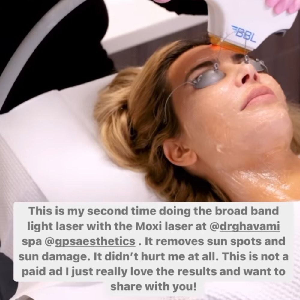 Kardashian posted a video showing herself receiving a broad-band light laser treatment with the Moxi laser courtesy of Beverly Hills plastic surgeon, Ashkan Ghavami, MD. As the celeb explained in the video's caption, the laser's main focus is to remove sun spots and sun damage in a non-ablative, pain-free way—emphasis on the pain-free. Throughout the video, Kardashian didn't even flinch, "it didn't hurt me at all," she confirms after undergoing her second round of the treatment.