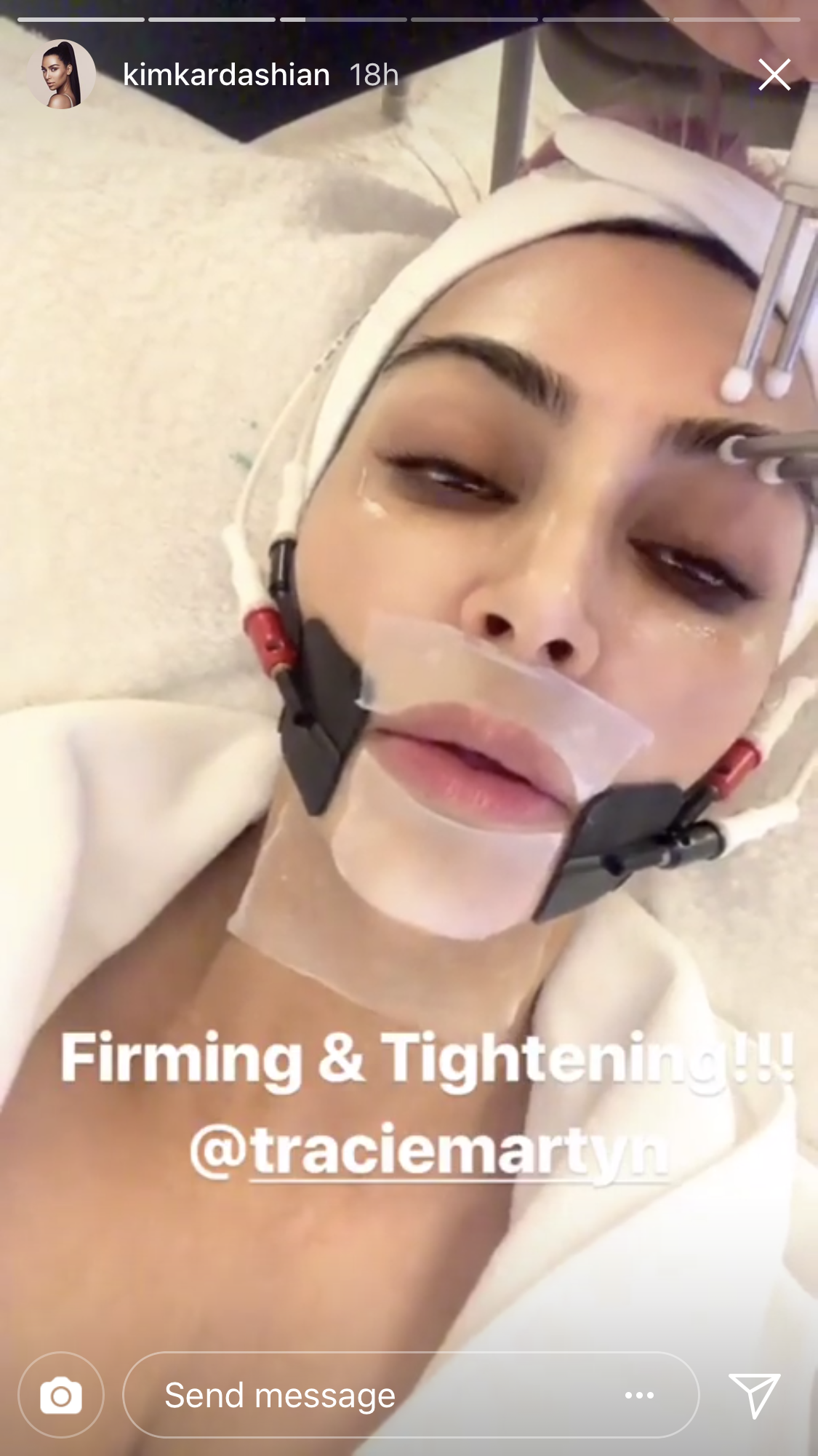 In the third post, Kim simply writes, “Firming & Tightening!!!” while Martyn smoothes the sculpting tool around Kim’s eyes to help with puffiness. At the same time, Kim has another device attached around her jawline.