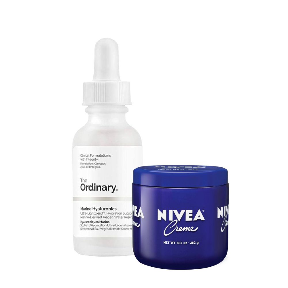 The provided “hack” for the two affordable products: Mixing the two at night to the tune of “a swipe of Nivea with 2–3 drops of the serum.” (Fun fact: The Nivea crème formulation is 100-plus years old.)