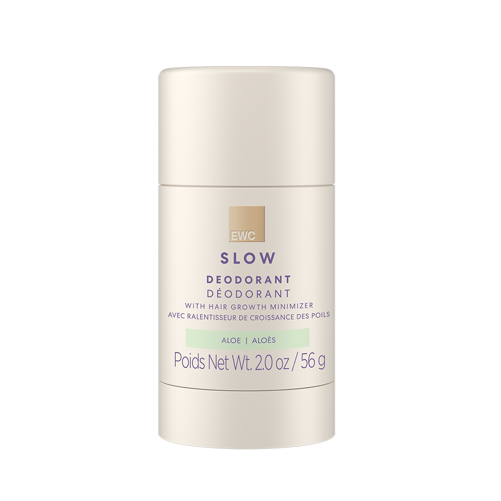 And last but not least is EWC's SLOW Aloe Deodorant, which is aluminum-free and part of the "SLOW" collection because it actually contains natural narcissus bulb extract, which helps slow hair growth and thin hair over time. "First of all, this is the perfect size—it fits in my purse really well. I can take this puppy with me anywhere. And it smells really good. It's a very neutral smell. I like smells that men could also wear—I'm not a fan of flowery or sweet smells. Outside of the fact that it smells good, the fact that you guys have made a product that can make my pits less hairy—I'm not the hairiest person in the world, but I'm on always stage. A thing I think about all the time is, 'Are my armpits hairy?' Nobody wants to see that. That's not cute. It also thins the hair too, so that's exciting."