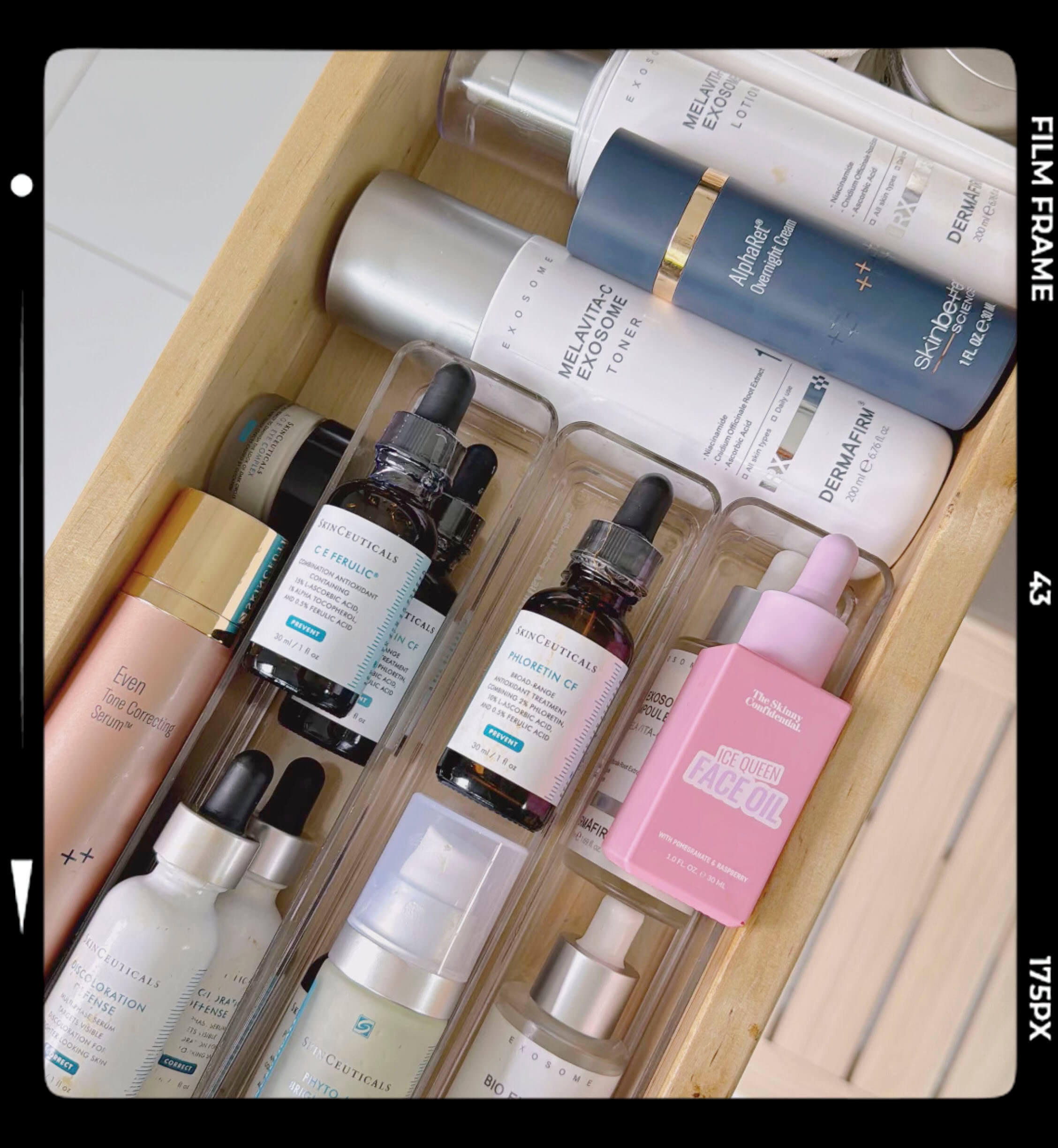 “SkinCeuticals makes solid products. I use them with my Korean skin care, and together, they work wonders. One of my favorite Korean brands is Dermafirm. Hyperpigmentation is an issue for me, so I love the Melavita line. From SkinCeuticals, I use C E Ferulic, Discoloration Defense, and others, and I pat them on—no rubbing.