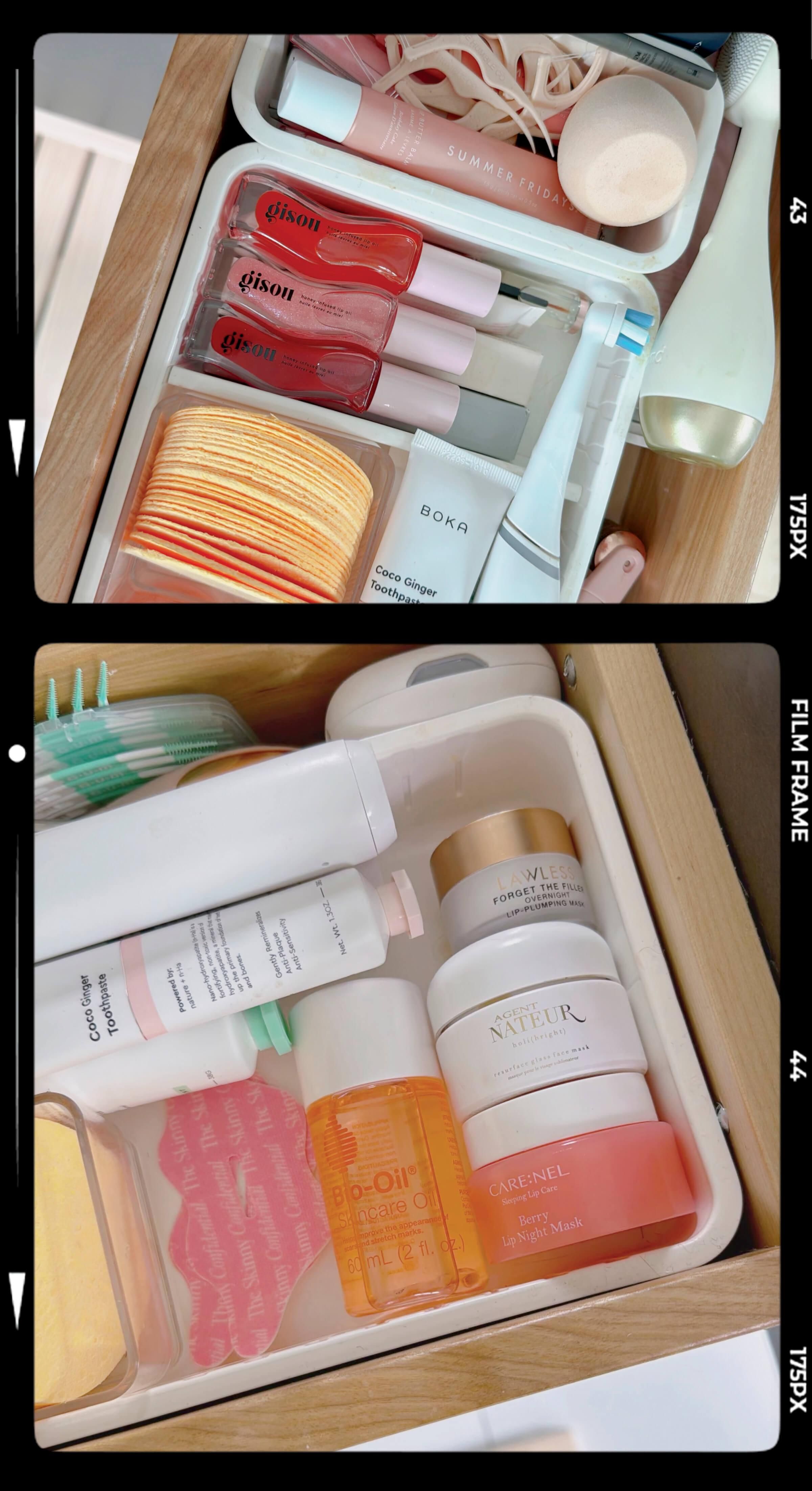 “I have lip products everywhere—like 600. The Gisou Lip Oil is amazing because the scent isn’t overwhelming and it makes your lips look like glass skin. It feels fresh. I prefer clean, shiny, clear lips with either no color or a light cherry. Summer Fridays Butter Balm is a really good one after I’ve done my skin-care routine and I’m winding down. I like vanilla and pink sugar.”