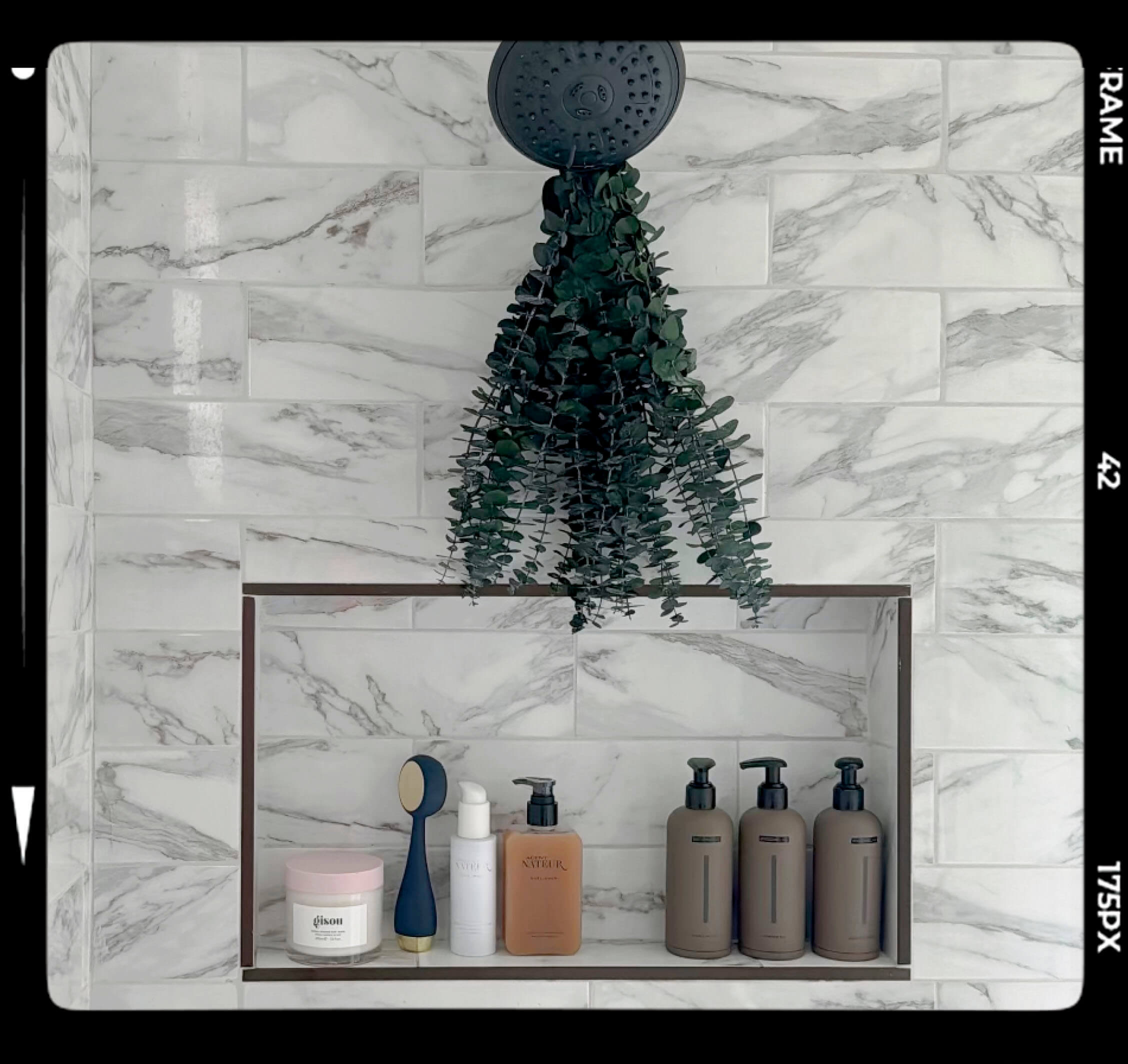 “Before I shower, I dry brush with my TSC Butter Brush. I’ve been doing this since 2014 and it’s so invigorating and the best way to exfoliate. In the shower, I hang eucalyptus. It’s such an easy, lazy-girl way to create a spa-like experience. Eucalyptus can help reduce stress, open sinuses and provide clarity. It’s the best at night. I also love PMD’s Clean Body device.
