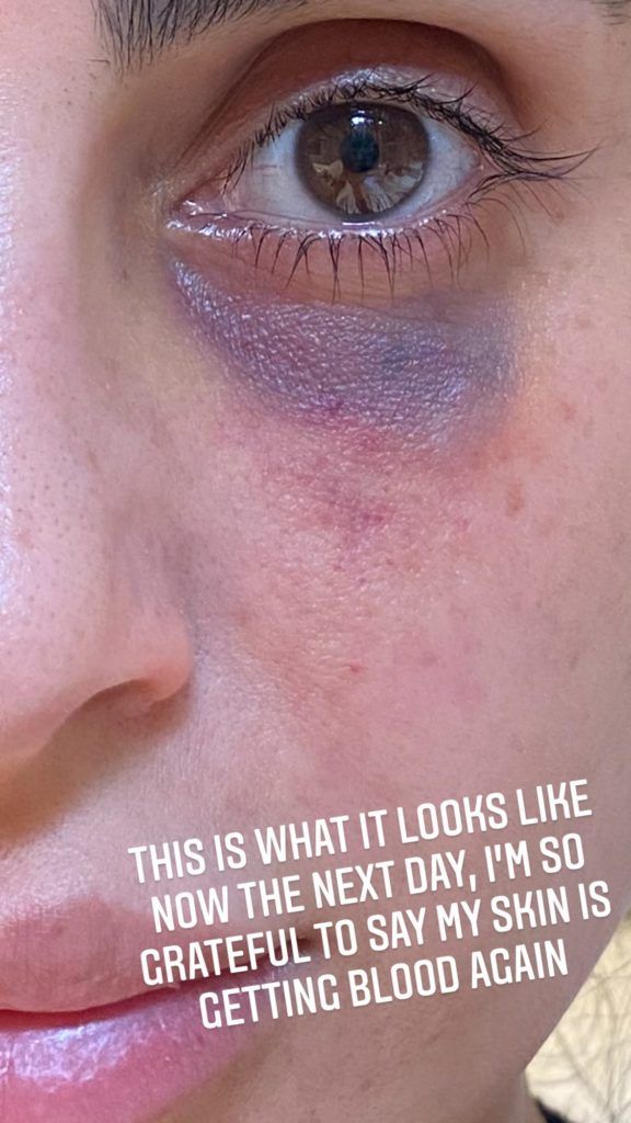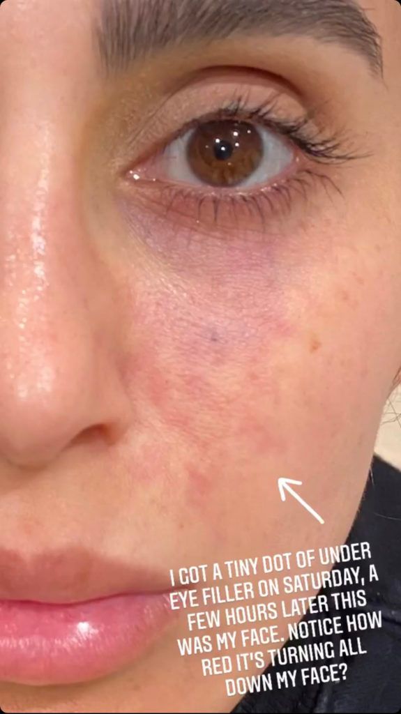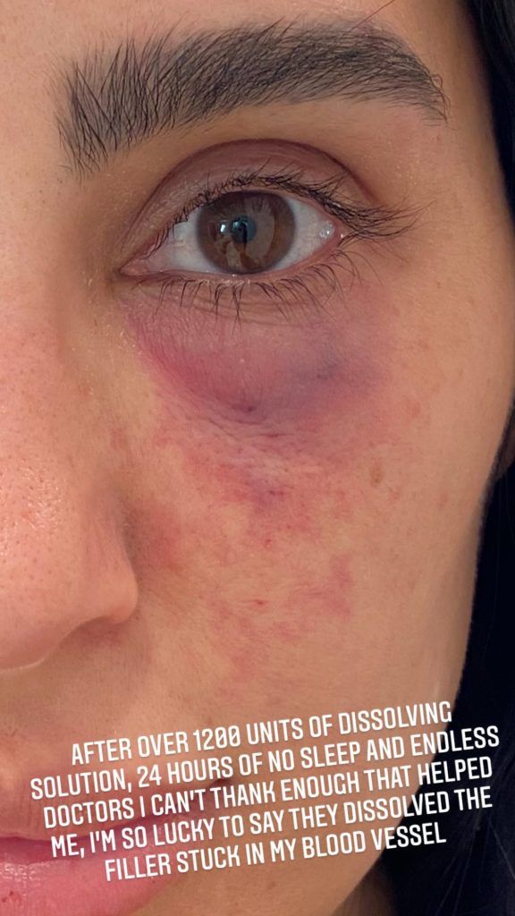 After receiving a bit of under-eye filler, Ghalichi started to notice that her skin appeared to be red and turning darker, as if it were bruised. Before she knew it, her skin began to get worse. What happened during her treatment is called Vacular Occlusion, which is caused by an accidental injection of filler into an artery.