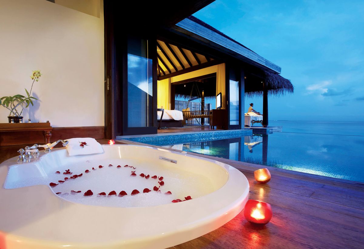 The island sanctuary offers many marine wonders, but most guests like to spend their time in their private villa pools and gigantic baths.