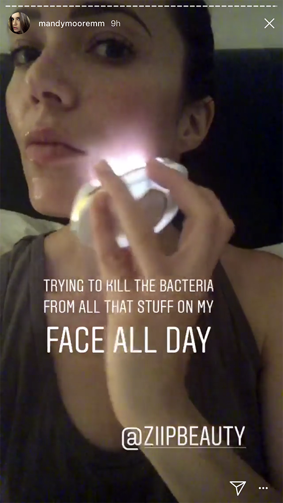 Layers of prosthetics, age makeup and heaps of patience go into every look (it takes multiple hours to create Pearson’s mid-60s look each morning) and as you can imagine, it can do a number on her skin if not careful. But the application of the stage makeup isn’t the only process Moore has been sharing with her fans. She recently shared a short clip of her using the ZIIP ($495), a nanocurrent device that addresses a variety of different skin conditions, captioning the below shot, “Trying to kill the bacteria from all that stuff on my face all day.”