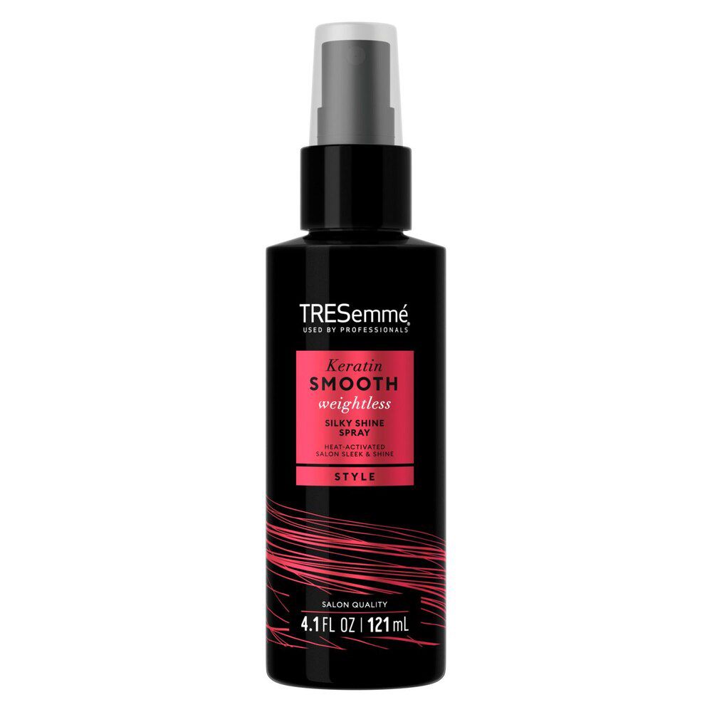 “Meghann’s hair is color-treated, so I always want to make sure I start with a hydrating shampoo and conditioner and use products that have heat protection in them but still feel lightweight like the new TRESemmé Keratin Smooth Weightless Silky Shine Spray ($8),” says Rozenberg. This spray, which is used on damp hair, “gives hair an added gloss to any style that helps make hair look and feel amazing.”