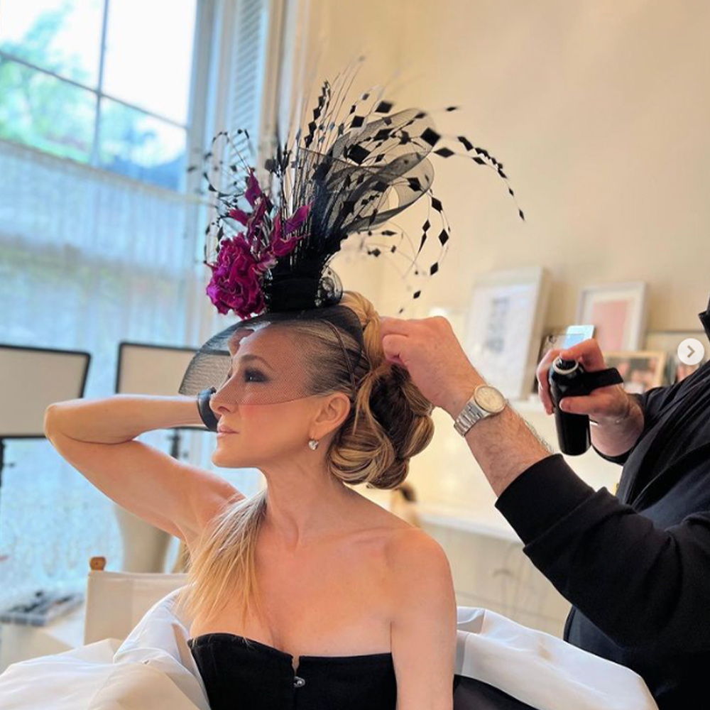 Philip Treacy served the drama on a silver platter with Sarah Jessica Parker's bold headpiece, and her thick, textured updo—done by hair icon Serge Normant—paired perfectly.