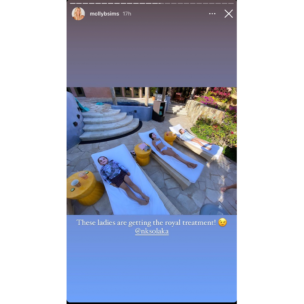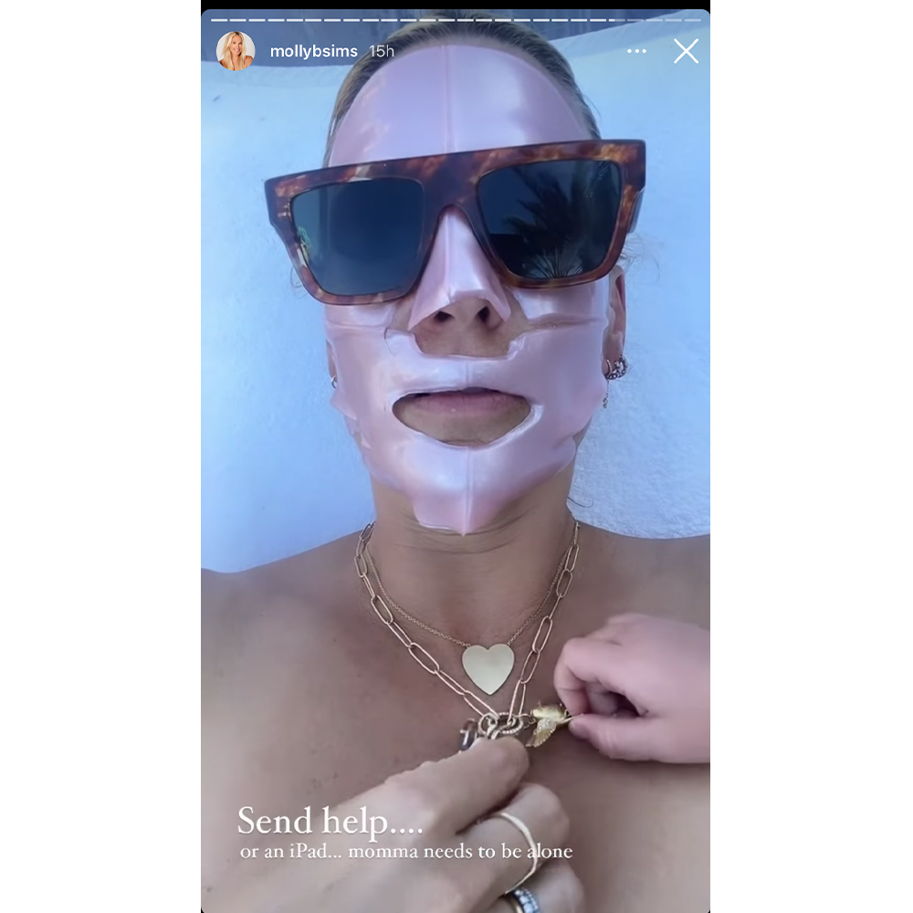 On her Story, Sims is seen laying by the pool with her kids, wearing the Knesko Rose Quartz Antioxidant Face Mask ($35), a product she later says she is "obsessed" with. Before we knew it, both her kids and their friends were rocking the mask, as the Yes Man star talks us through the nitty gritty. "I'm telling you, this Knesko Rose Quartz mask is amazing," she says as she smooths the mask onto her face. Her quick moment of rest and relaxation is soon interrupted by her son Grey. "Send help...Or an I Pad...Momma needs to be alone," she writes.